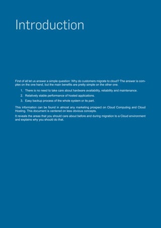 The document outlines the comprehensive process of migrating to the cloud, emphasizing both the benefits and key considerations involved. It highlights the importance of assessing cloud providers through a structured questionnaire and testing for performance, scalability, and security before making the migration decision. The proposal includes static and dynamic checks to ensure readiness and reliability of the applications during the migration process.