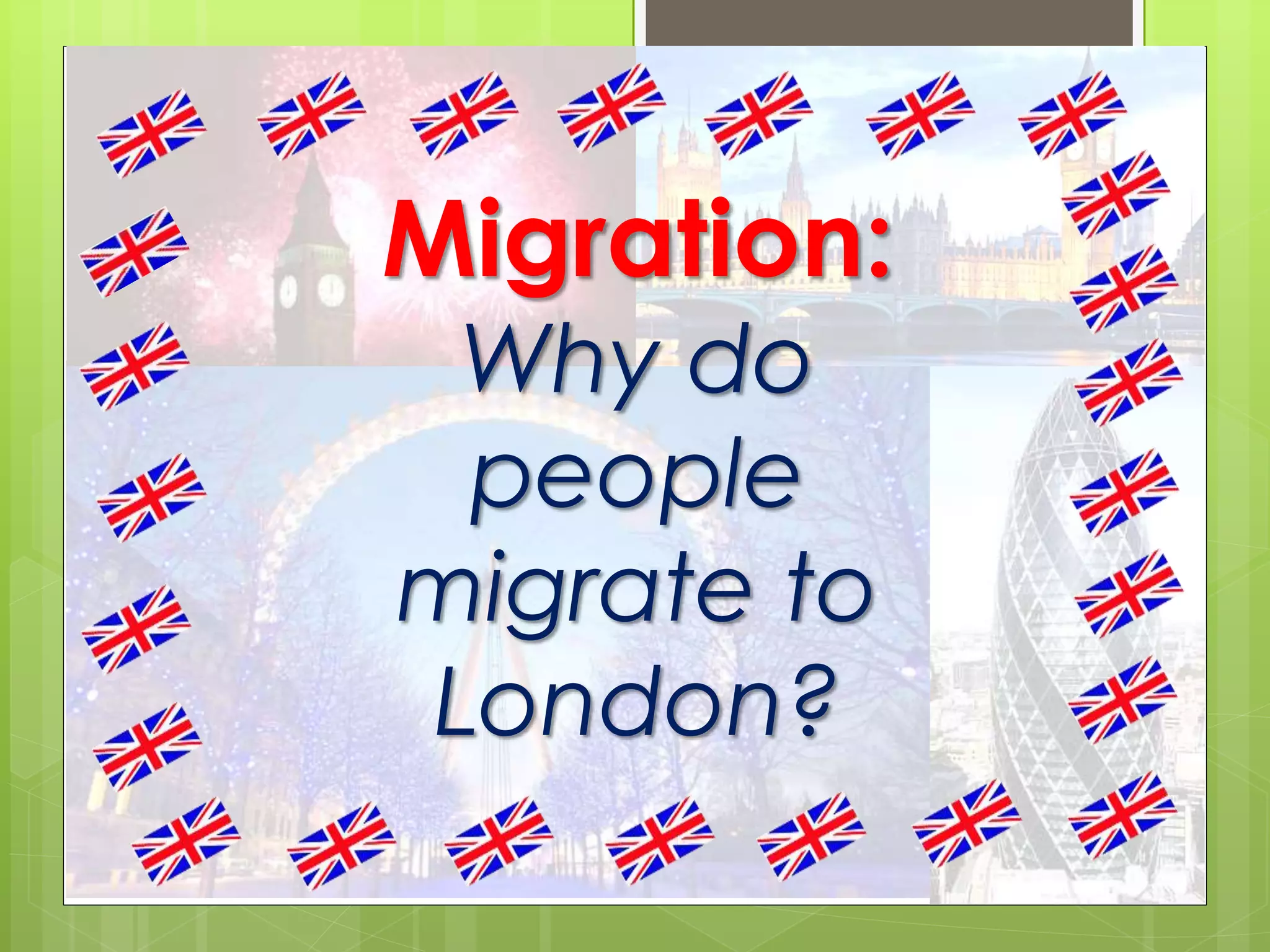Many immigrants migrate to London for work opportunities and higher wages, especially in jobs related to the city's major attractions like St. Paul's Cathedral, Tower Bridge, and the London Eye. Some of the reasons given for migrating include being able to earn enough money to support their families, access to company benefits like paid holidays, and London being a diverse and welcoming place with opportunities to improve English skills. However, some sources suggest that immigrants are really coming for benefits from the government like free housing, healthcare, and schooling. Others argue that immigrants are taking jobs from citizens and placing too much burden on taxes. Overall, London is appealing for its variety of sectors, economy, businesses, and benefits system.
