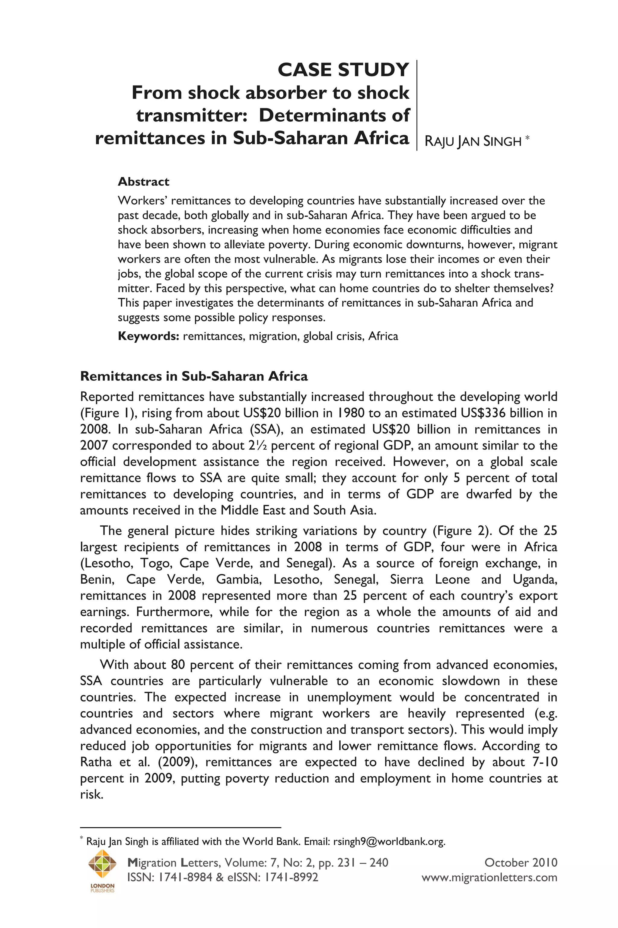 2) The study analyzes factors that influence remittance flows to 36 Sub-Saharan African countries from 1990 to 2005. It finds that higher incomes and larger populations of expatriates in host countries are associated with higher remittances, suggesting remittances may decline with economic downturns that reduce migrant incomes and numbers.