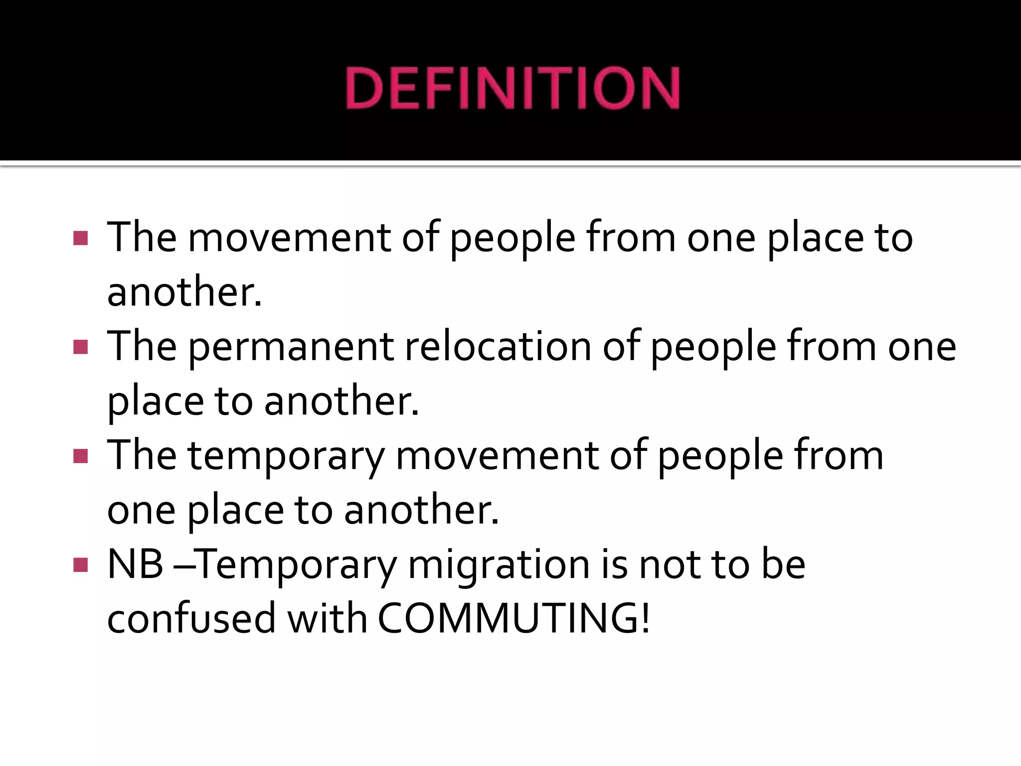 This document discusses different types of human migration including permanent, temporary, internal, international, rural-urban and forced migration. It defines each type and provides examples. Key points include that temporary migration involves short term movement while permanent migration means not returning home. Internal migration is within a country often from rural to urban areas. International migration crosses country borders. Rural-urban migration sees movement from farms to cities. Forced migration is involuntary due to issues like persecution. Migration has push factors like lack of jobs in the origin country and pull factors like opportunities in the destination country. Consequences of migration can be positive such as cultural diversity or negative like population pressure on resources.