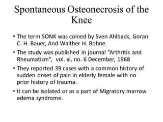 The document presents a detailed case study of a patient with transient osteoporosis of the hip (TOH) and spontaneous osteonecrosis of the knee (SONK) treated at Choithram Hospital & Research Centre in India. Over 20 years, the patient experienced multiple episodes of TOH and SONK with no history of trauma or co-morbidities, resulting in resolutions and recurrences of conditions. The information is intended for orthopedic surgery students and highlights personal experiences and case collections, with a disclaimer regarding content usage and potential controversies.