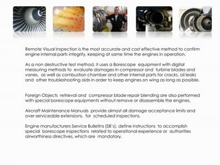 Remote visual inspection using borescope equipment is a non-destructive testing method that allows evaluation of engine internal parts like compressor blades for cracks or leaks without disassembling the engine. Borescope inspections can retrieve foreign objects and perform compressor blade repairs to keep engines in operation longer in accordance with aircraft maintenance manuals and engine manufacturer service bulletins. As a borescope inspector, it is important to be accurate and make safety-focused judgments, as improper assessments can result in personal and economic damages in the safety-critical field of aviation.
