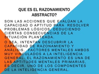 The document discusses abstract reasoning and creativity. It defines abstract reasoning as using logic to deduce conclusions from a given situation and assess problem-solving abilities. It involves discovering reasoning and analytical skills, which are mentally linked to general intelligence. Creativity is defined as the ability to create new and valuable things through original problem-solving and conclusions. It should be intentional and aim for an objective, taking artistic, literary or scientific forms. A creative act involves receiving an idea, thinking, graphic planning, designing, modifying, solving, planning, constructing, creative action, exposing, and validating the idea.