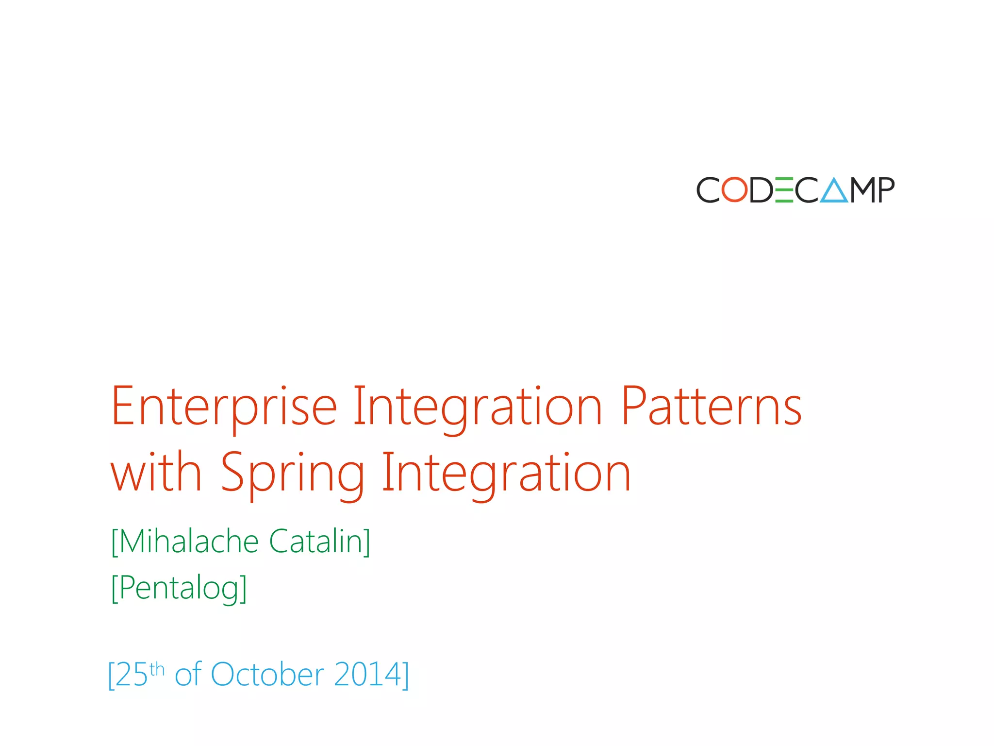 The document discusses using Spring Integration and Enterprise Integration Patterns (EIP) to integrate the systems of an online retailer called WGRUS. It provides an overview of Spring Integration and EIPs, describing common patterns like channels, gateways, routers and how they address integration challenges. It then gives examples of implementing various EIP patterns with Spring Integration components to integrate WGRUS' order intake and processing across different channels.