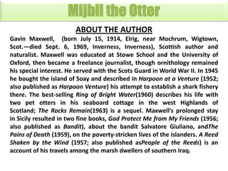 Gavin Maxwell wrote about his experiences owning pet otters. In 1956 while in Iraq, Maxwell was gifted an otter named Mijbil. Mijbil loved playing with water and became very friendly with Maxwell. Transporting Mijbil back to London by plane was difficult, as he escaped from his box during the flight. Eventually, Maxwell and Mijbil arrived safely in London. There, Mijbil enjoyed playing with toys, going for walks on a lead, and running along a nearby school wall, surprising onlookers who had never seen an otter.