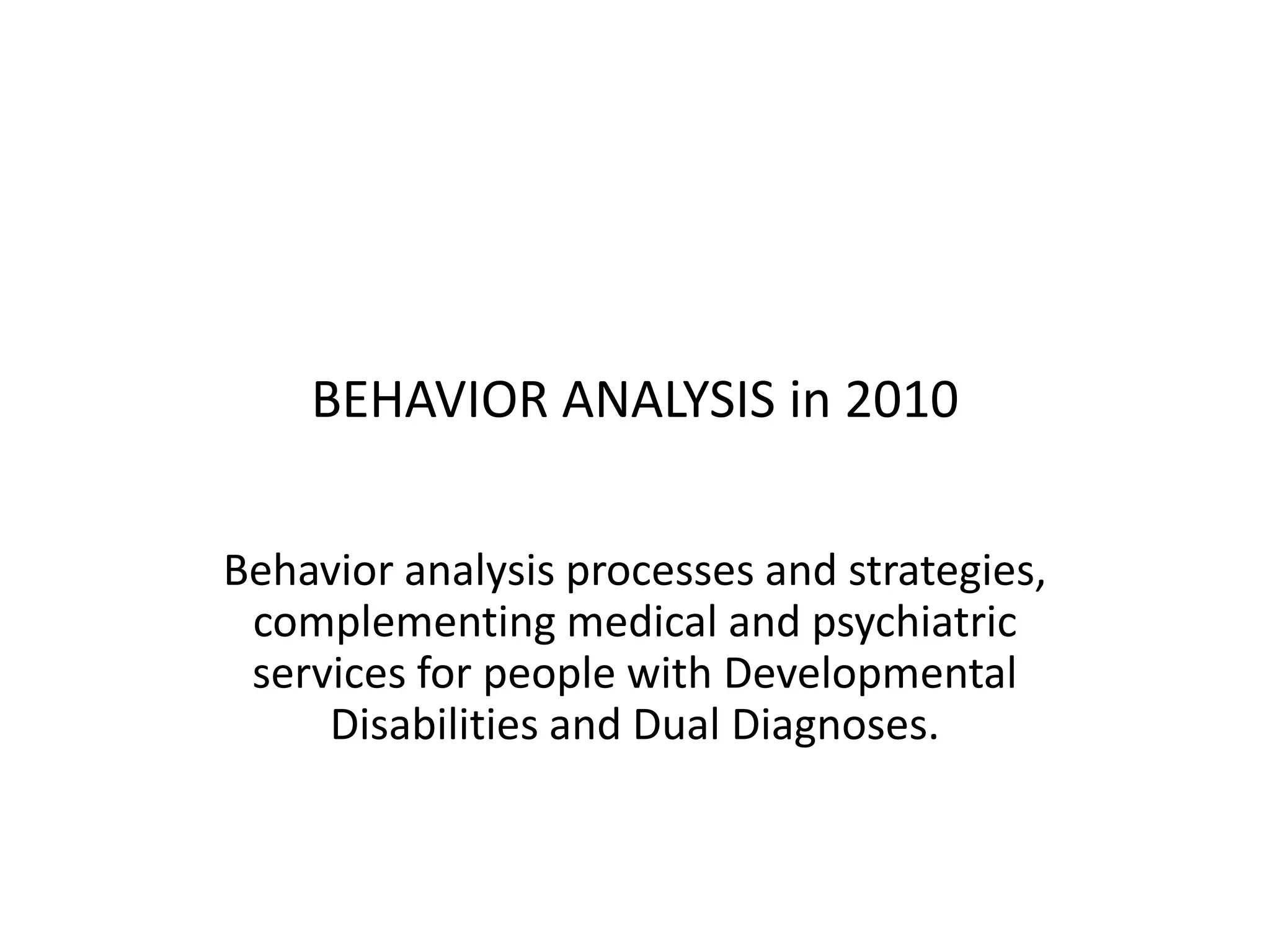 This document provides an overview of behavior analysis as a natural science approach to understanding behavior. It describes how behavior analysis has evolved from early psychology to become a data-driven science focused on observable behavioral processes rather than hypothetical constructs. Key aspects of radical behaviorism are discussed, including its empiricism, determinism, and analysis of behavioral functions like reinforcement, motivating operations, and discriminative stimuli. The document emphasizes that behavior analysis strategies involve assessing environmental influences on behavior through functional behavior assessments and designing interventions to strengthen desirable behaviors based on reinforcement.