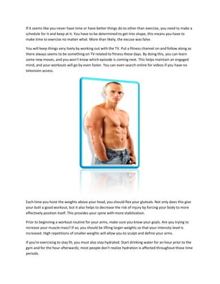 The document provides tips for starting an exercise routine and maintaining fitness. It recommends making time for exercise by scheduling it, keeping workouts engaging by exercising with TV, focusing on weaker areas, including both cardio like jogging and strength training, stretching for flexibility, and proper breathing. The overall message is that fitness is a lifelong commitment that requires consistency over time.