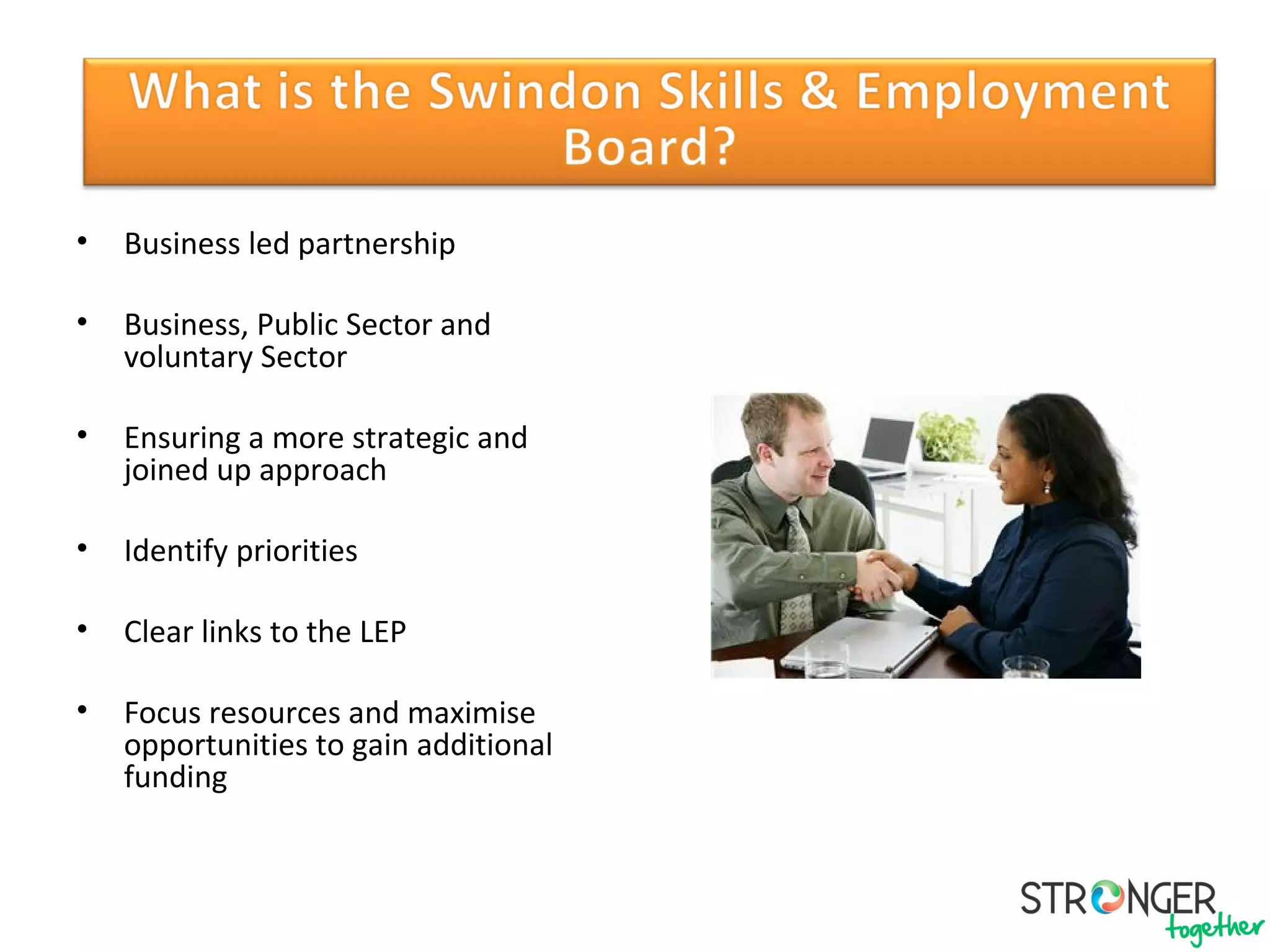 The document summarizes the priorities and governance structure of the Swindon Skills & Employment Board. It identifies their key priorities as: [1] equipping young people with skills to enter the labor market; [2] ensuring current workforce has skills needed now and in the future through being responsive to business needs; and [3] raising the area's higher skills base. It notes strengths like high employment and productivity but also challenges like skills shortages and gaps hindering growth. Employers are asked to provide feedback, champion the strategy, and support young adults through work opportunities.