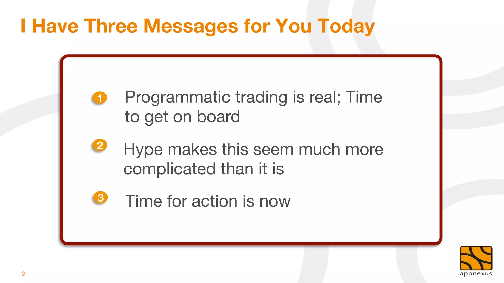 1) Programmatic trading is a real technology that has disrupted the advertising industry over the past seven years, allowing for more efficient automated trading between buyers and sellers of digital ads.