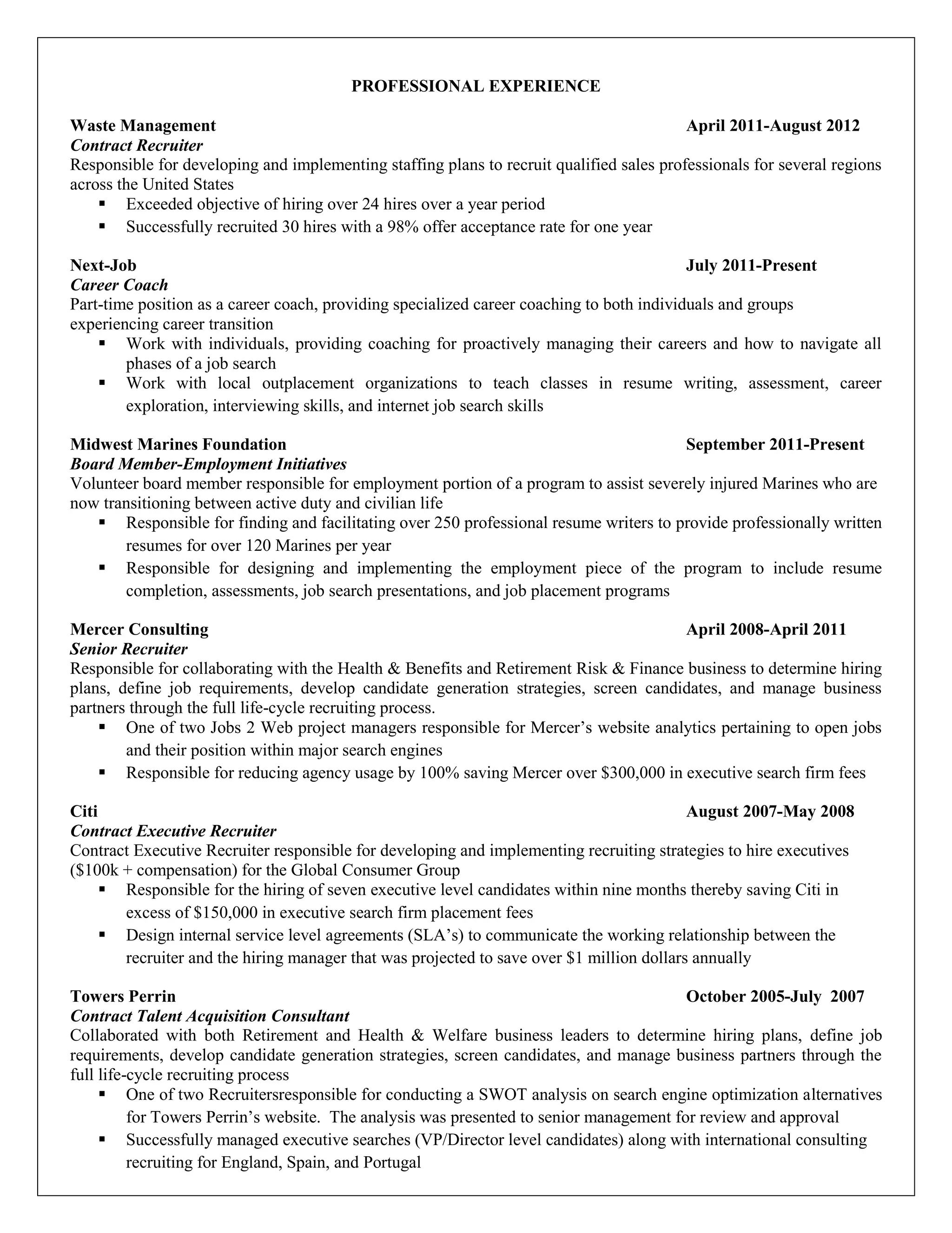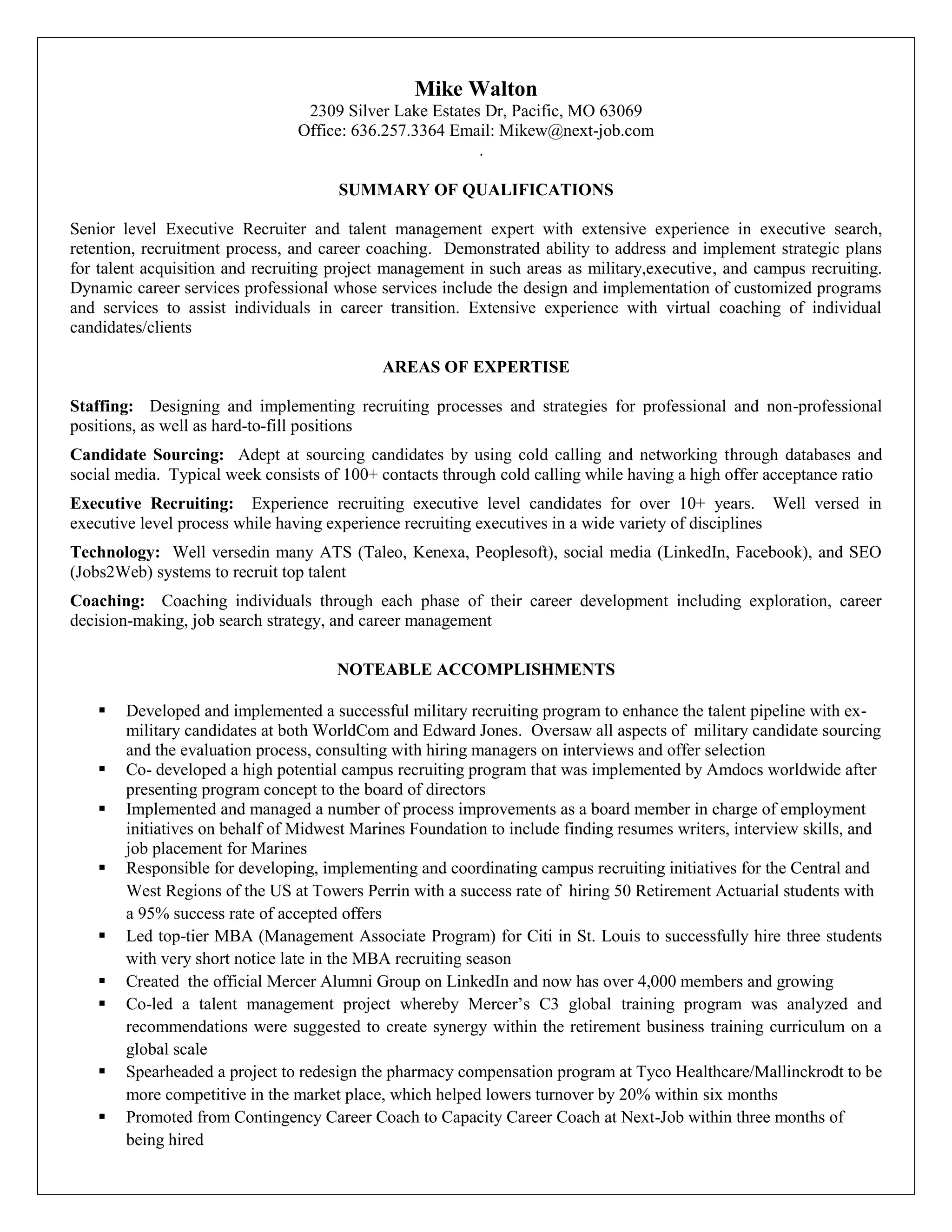 Mike Walton is a senior executive recruiter and talent management expert with over 20 years of experience in executive search, recruitment, and career coaching. He has expertise in staffing, candidate sourcing, executive recruiting, and career coaching. Notable accomplishments include developing successful military and campus recruiting programs, meeting aggressive hiring goals, and implementing process improvements. He currently works as a career coach and volunteers with a program assisting injured Marines.