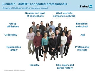 LinkedIn is a social network for professionals with over 34 million members. It allows members to find people they know, share updates, find jobs, make business connections, and get news and advice. Advertisers on LinkedIn can use tools like company pages, targeted advertising, polls, discussions, and partnering with influencers to engage with professionals on the site. An example campaign by Banana Republic gave LinkedIn members incentives to improve their profiles and passed along the offer virally, engaging over 77,000 members.