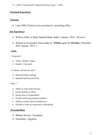 Mikhail Monsef Elia is seeking a responsible position utilizing his language, presentation, and communication skills. He has a B.Sc in Commerce from Assiut University with a grade of 74.7%. He has work experience as a teller at Qatar National Bank Alahli and as an accountant team leader at ATData. He is proficient in English and Arabic with computer skills in Microsoft Office and experience in customer service, business English, accounting, and foreign exchange trading.