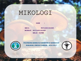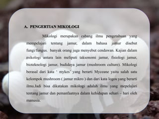 Mikologi mempelajari jamur/fungi. Kajiannya meliputi taksonomi, fisiologi, bioteknologi, dan budidaya jamur. Jamur memiliki ciri berupa hifa dan spora, tidak berfotosintesis, dan berkembang biak secara seksual dan aseksual. Habitat jamur beragam namun lembab. Bentuk jamur ada 3: khamir (uniseluler), kapang (multiseluler berhifa), dan jamur (besar dapat dilihat mata telan