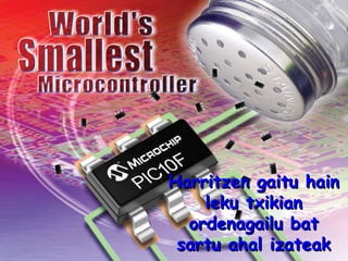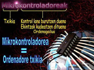 Mikrokontrladoreak 1. Txikia Kontrol lana burutzen duena Ekintzak kudeatzen dituena Ordenagailua Ordenadore txikia Mikrokontroladorea = 2. 3. 4. Ia ez ditugu ezagutzen, baina mikrokontroladorez inguratuta gaude. 5. 6. Zure etxeko edozein tresnatan, adibidez mikrouhinetan,... ...LED erako display bat badu... ...edo LCD pantaila bat... ...eta teklatu txiki bat badu... Inguruan bai, baina non daude mikrokontroladore horiek? 7. 8. 9. 10. Mikrokontroladorak erabiltzeak tresnen funtzionamendu era aberasten du. Hurrengo orduetan mikrokontroladoreak nola erabili ikasiko dugu. Gure proiektu bat edo muntaia sinple bat mikrokontroladore baten esanetara jarriko dugu.
