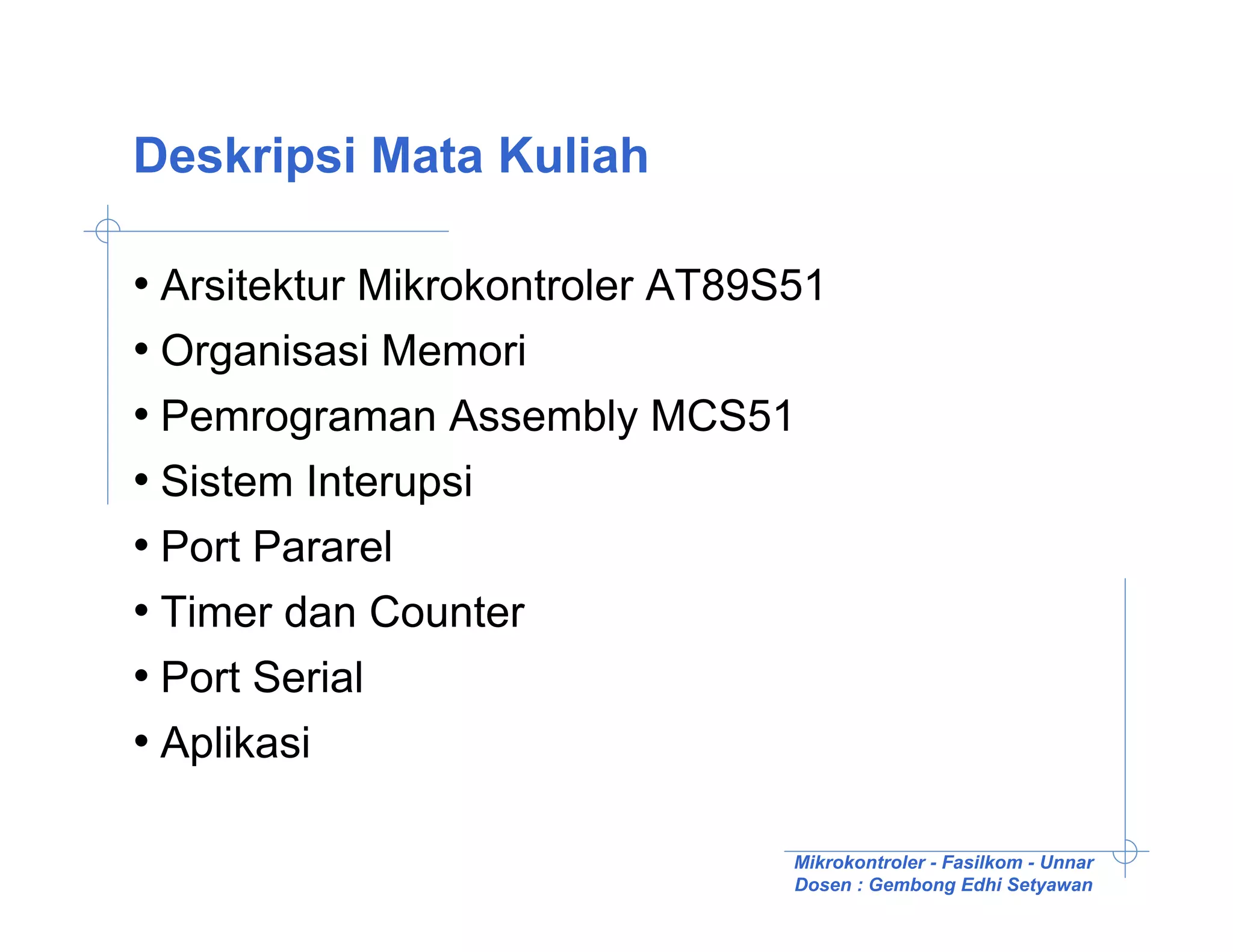 Dokumen ini adalah panduan pengantar untuk mata kuliah mikrokontroler yang mencakup arsitektur, pemrograman, dan aplikasi mikrokontroler AT89S51. Materi mencakup organisasi memori, sistem interupsi, penggunaan port I/O, timer, dan konektivitas serial. Juga disertakan adalah tugas besar yang meminta mahasiswa untuk membuat aplikasi menggunakan mikrokontroler.