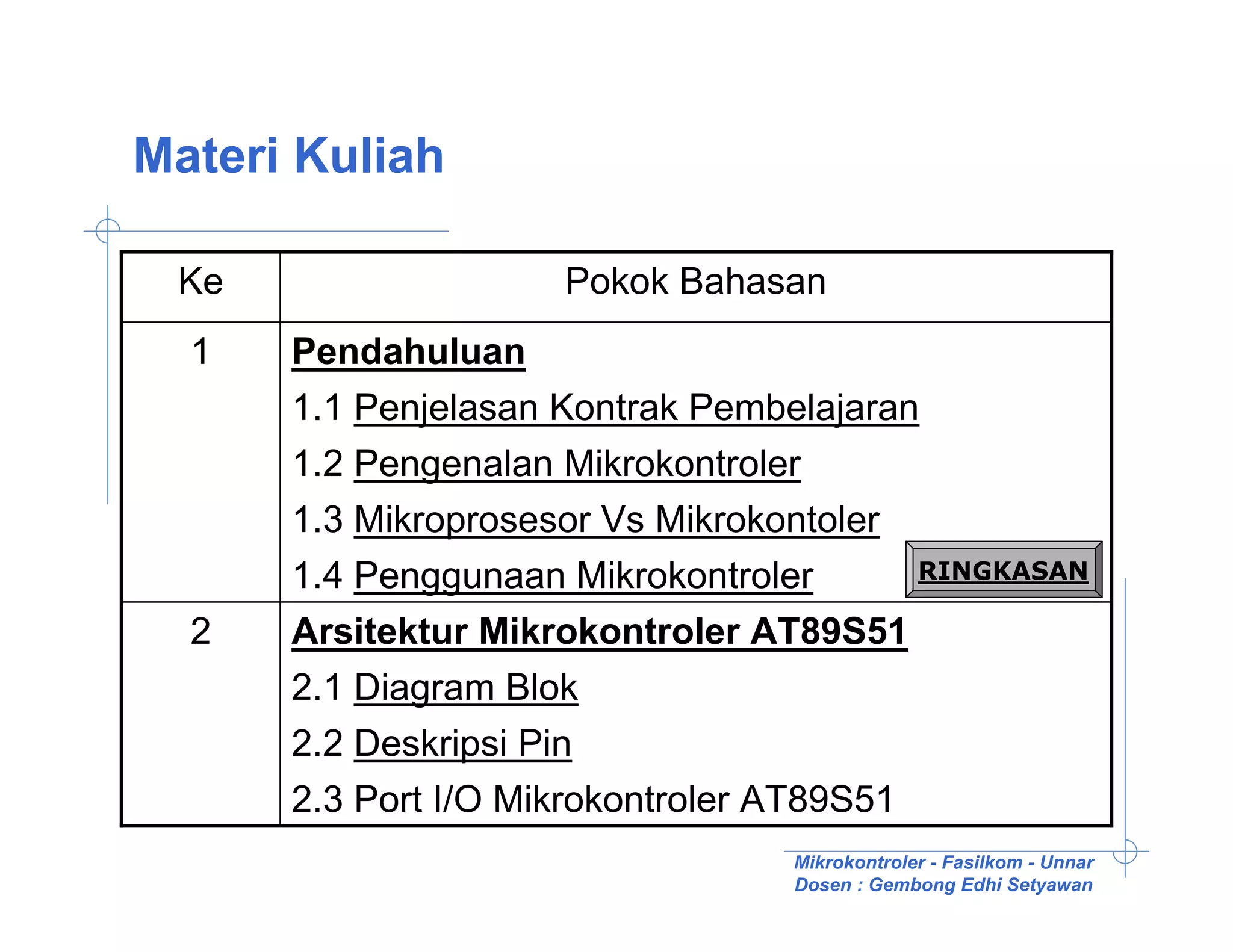 Dokumen ini membahas tentang mikrokontroler AT89S51, mencakup pengenalan, arsitektur, organisasi memori, serta instruksi-instruksi dalam bahasa assembly. Materi kuliah juga mencakup sistem interupsi, penggunaan port paralel, timer, counter, dan port serial dengan contoh aplikasi dalam pemrograman. Selain itu, dokumen ini menjelaskan operasi aritmatika seperti penjumlahan dan pengurangan, serta penggunaan flag dalam operasi tersebut.
