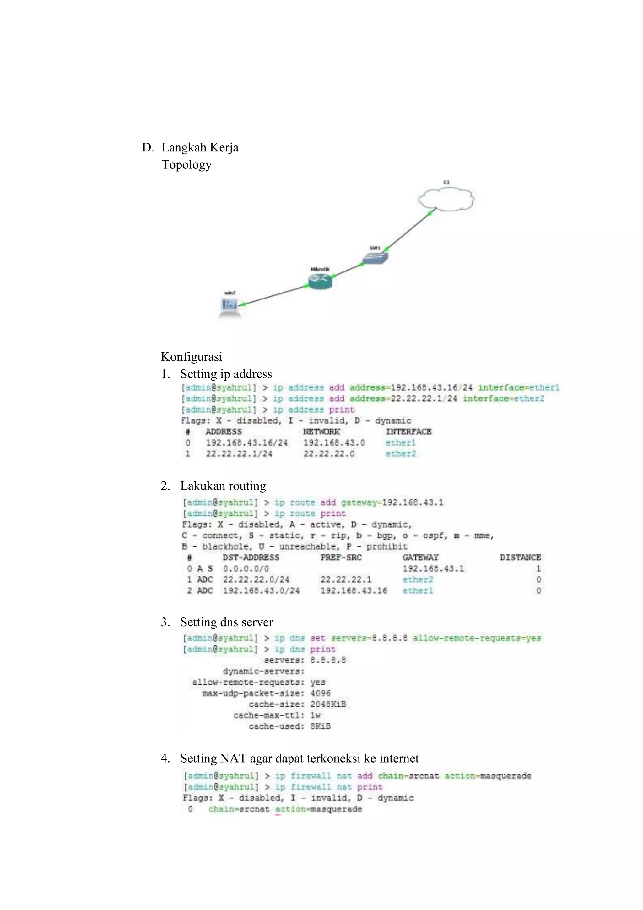 Dokumen ini membahas tentang implementasi firewall menggunakan router Mikrotik, termasuk tujuan, alat, dan langkah kerja yang diperlukan. Firewall berfungsi untuk melindungi jaringan dari serangan luar dan mengelola aliran data, sementara address list memungkinkan administrator untuk memblokir akses ke situs tertentu secara manual maupun otomatis. Kesimpulannya, penggunaan chain tambahan dan address list mempermudah konfigurasi firewall yang lebih luas.