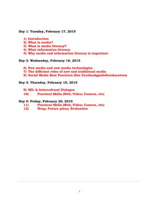 This 4-day course covers topics related to media and information literacy including what media and information literacy are, why they are important, new media technologies, social media best practices, and how media and information literacy can promote intercultural dialogue. Each day focuses on different topics, such as traditional vs new media roles, practical skills for using technologies like video cameras, and evaluating a plan for future activities. The goal is to help teachers, students, and youth develop media and information literacy skills to become agents of positive social change and enhance understanding across cultures.