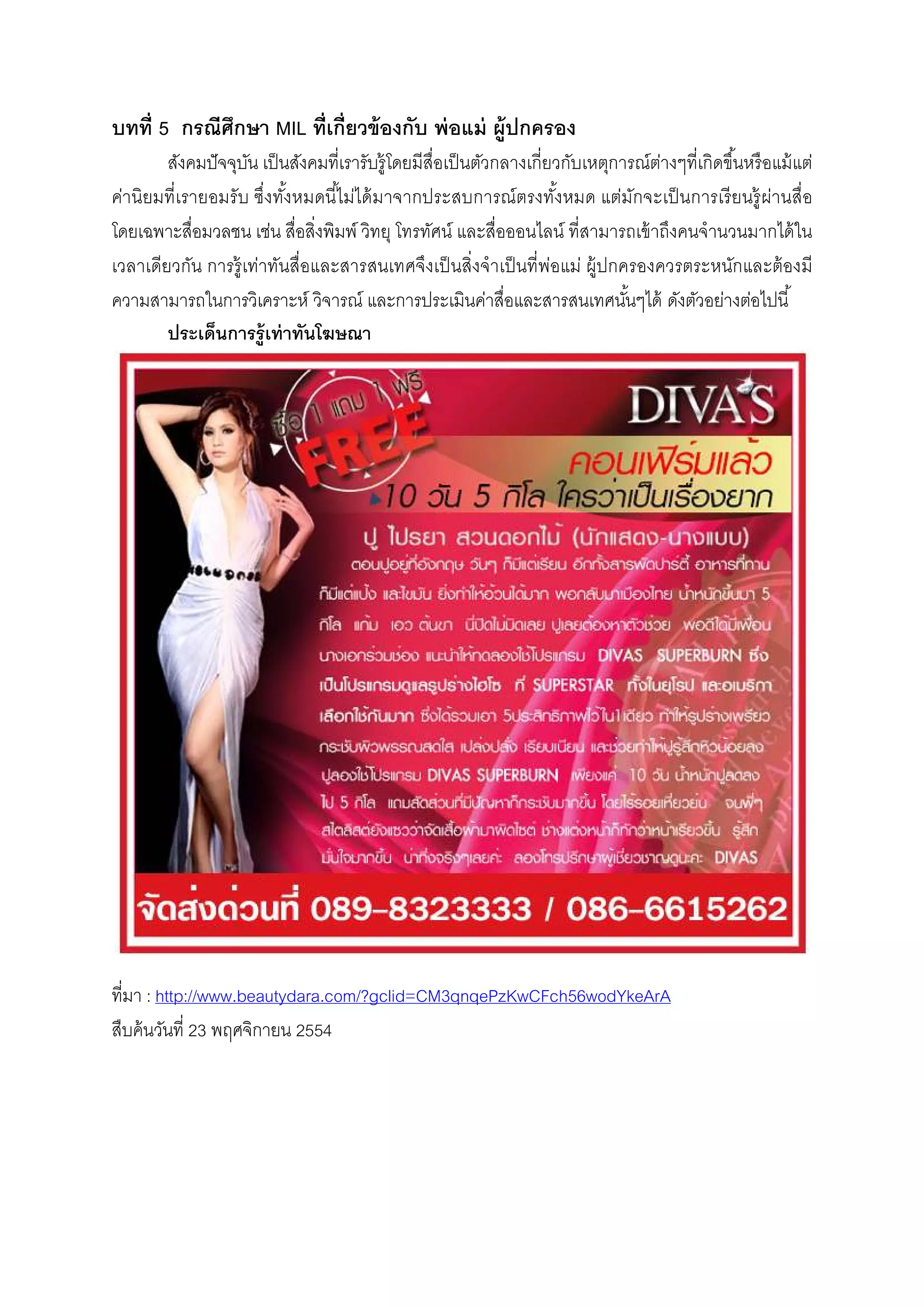 า เสนอยื น โพสต์ ท่ า พร้ อมการแต่ง กายที หรู ห รา เพื อเป็ นการยื น ยัน รู ป ร่ า ง หน้ าตา การดูดี ดูเข้ ากับวัยของกลุมเปาหมาย และดูไฮโซ ทันสมัยและน่าเชือถือไปพร้ อมๆ กันด้ วย ่ ้ อีกทังยังปิ ดท้ ายการขายด้ วยความคล่องแคล่ว และชัดเจนคือ “จัดส่งด่วนที.....” 3. การเข้ าใจสือและสารสนเทศหรื อการตีความจากสือนันๆ (Interpret) จากชินงานโฆษณาออนไลน์ดงกล่าวแสดงให้ เห็นว่า ทังรู ปภาพของผู้นําเสนอ (presenter) ที ั แสดงให้ เห็นถึงเรื อนร่ างและหุ่นทีสวยงาม ทันสมัย หรูหรา และเนือหาทีบอกเล่าจากประสบการณ์ ของผู้ นําเสนอ เพื อต้ องการที จะชักจูงใจให้ ผ้ ูเปิ ดรั บสื อ หรื อกลุ่มเปาหมายชื นชอบ และอยากทีจะมีรูปร่ างดี ้ เหมือนกับผู้นําเสนอ โดยสามารถติดต่อได้ แบบด่วนและเห็นผลภายใน 5-10 วันด้ วยการซือสินค้ าและใช้ ผลิตภัณฑ์ดงกล่าว อีกทังยังเพิมความน่าเชือถือด้ วยการทิงท้ ายประโยคว่า “ลองโทรปรึ กษาผู้เชียวชาญ ั นะคะ” ซึงสือก็เน้ นว่าสามารถทําได้ จริ งโดยดูตวผู้นําเสนอเป็ นตัวอย่างพร้ อมกับเน้ นว่าสามารถ “ปรึ กษา ั ผู้เชียวชาญของผลิตภัณฑ์นนๆได้ ด้วย” ซึงในความเป็ นจริ งแล้ ว กลุ่มเปาหมายหรื อผู้รับสารไม่สามารถที ั ้ จะทราบได้ เลยว่าผู้เชียวชาญทีอ้ างถึง หมายถึงคือใคร มีความรู้ เกียวกับประโยชน์และโทษของสินค้ าและ ผลิตภัณฑ์มากน้ อยขนาดไหน หรื อแท้ ทีจริ งแล้ ว พวกเขาอาจเป็ นเพียงกลุ่มคนทีทําหน้ าทีโน้ มน้ าวชักจูงใจ ให้ ผ้ บริ โภคคล้ อยตามเพือกระตุ้นยอดขายเอาเงินเข้ ากระเป๋ าตัวเองเท่านัน เพราะเมือเข้ าไปตรวจสอบ ู ข้ อมูลเกียวกับประเด็นนี ในเว็บไซต์ดงกล่าว ไม่มีการให้ ข้อมูลไว้ ั 4. การประเมินค่ าสือและสารสนเทศนันๆ (Evaluate) จากโฆษณาขายผลิตภัณฑ์ลดนําหนักทางอินเทอร์ เน็ตชินนีพบว่า สิงทีสือนําเสนอเน้ นการให้ ข้อมูล เพียงด้ านเดียว เกียวกับเรื องราวดีๆ ของผู้นําเสนอ และชือของโปรแกรม DIVAS SUPERBURN เท่านัน (เป็ นการให้ ความเห็น และหรื อเป็ นเพียงอารมณ์ หรื อทัศนคติส่วนตัวของสือหรื อเจ้ าของกิจการฝ่ ายเดียว) ในส่วนทีเป็ นข้ อมูลหรื อทีเป็ นข้ อเท็จจริ งทีเกี ยวข้ องไม่มีเลย จึงอาจกล่าวได้ ว่า เนือหาทีสือโฆษณาชินนี นําเสนอขาดความน่าเชือถือมาก จําเป็ นทีจะต้ องมีการตรวจสอบหรื อวิเคราะห์ในประเด็นต่างๆ ดังต่อไปนี เช่น 4.1 เนือหาทีนําเสนอ เป็ นเพียงการบอกเล่าจากผู้นําเสนอ (presenter) เพียงคนเดียว ขาดความน่าเชือถือ ซึงผู้นําเสนอดังกล่าวเป็ นดาราและนางแบบทีเหมือนกับว่ามีเจตนาใช้ ชือ และรู ปร่ าง หน้ าตา เสือผ้ า ทรงผม อีกทังเนือหาทีนําเสนออาจจะเป็ นการเล่าเรื องทีแต่งขึนมาเพือโฆษณาสรรพค
