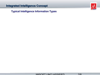 Mil-INTEL supports all phases of the intelligence cycle from the tactical to strategic levels, provides seamless integration between levels, and manages intelligence resources, collection, processing, and dissemination. It also integrates intelligence from different sources like imagery, signals, open sources, and humans. Mil-INTEL is designed to be network-centric, adaptable to organizational changes, and allows collaboration between civilian and military intelligence systems.