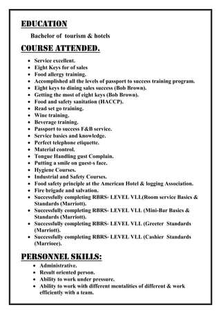 This document contains a CV for Milad Fawzy wahba. It includes personal information such as date of birth, place of birth, and contact details. It outlines his education as a Bachelor of Tourism & Hotels graduate. It also lists his language, computer, hotel training courses, and employment history working as a waiter and trainee at hotels in Sharm El Sheikh, Egypt. His skills and interests are mentioned, along with achievements and Harvard management courses completed. References are available upon request.