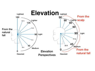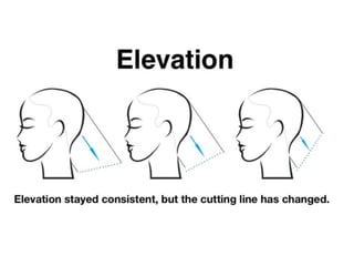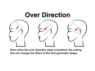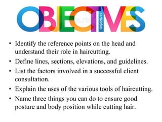 This document provides an overview of haircutting techniques and tools. It begins by identifying key reference points on the head and defining lines, sections, and angles used in haircutting. It then explains the importance of client consultation and lists various haircutting tools. The document outlines three basic haircutting techniques - one length, graduation, and layering cuts. It provides examples of different texturizing techniques and safety tips for haircutting. Overall, the document serves as a guide for the foundational skills, principles, and techniques of haircutting.
