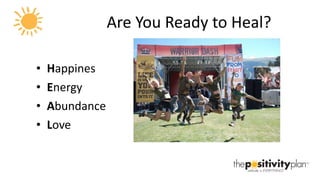The document discusses strategies for increasing happiness and well-being, including exercising regularly, eating a Mediterranean diet high in antioxidants, practicing gratitude, and changing negative thought patterns. It also provides tips for brain training, stress management, and creating a daily routine focused on healthy habits in order to live a more fulfilling life and positively impact others.