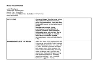 The document analyzes the music video for Miley Cyrus' song "Wrecking Ball". It discusses the intentions behind changing Miley's star persona from her innocent Hannah Montana image to a more risqué, promiscuous and explicit image. It analyzes how the music and visuals relate to each other and the lyrics. It also examines intertextual references to other music videos, how the video fits with and diverges from the pop genre, and who the target audience is intended to be.