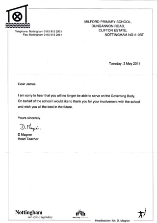 The document is a letter from the head teacher of Milford Primary School thanking James for his involvement with the school's governing body. The head teacher expresses regret that James will no longer be able to serve on the governing body and wishes him all the best for the future. The letter is signed by the head teacher, D Magner, and provides contact details for Milford Primary School.