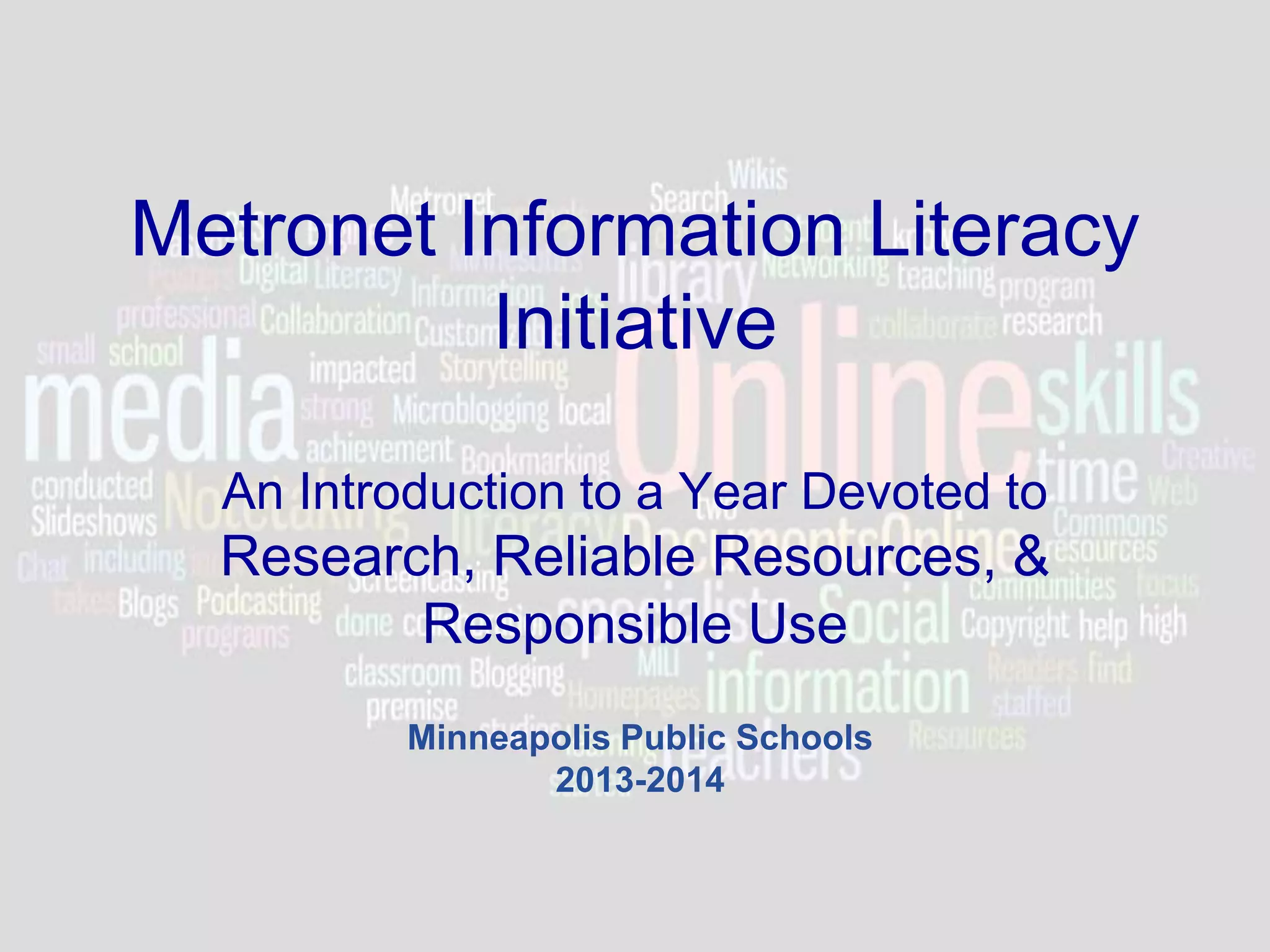 The Metronet Information Literacy Initiative (MILI) aims to influence how teachers teach the research process and encourage collaboration between teachers and librarians on research. MILI focuses on helping students develop skills in the three R's: research process, finding reliable resources, and responsible use of information. MILI will provide guidance to teachers on teaching these skills and incorporating information literacy into the curriculum. The goals are to improve students' research abilities and promote 21st century learning.