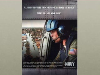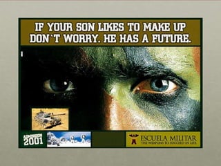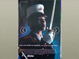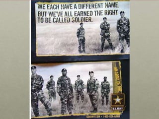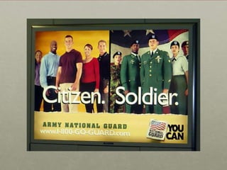 This document discusses the concept of militarization and related issues surrounding the military. It defines militarization as "the contradictory and tense social process in which civil society organizes itself for the production of violence" and involves intensifying resources for military purposes and shifting societal beliefs to legitimize violence and standing armies. The document also addresses questions about how the military is marketed and the social effects of the military. It discusses the repeal of "Don't Ask Don't Tell" and the integration of women and those with dissonant gender/sexual characteristics into the military.