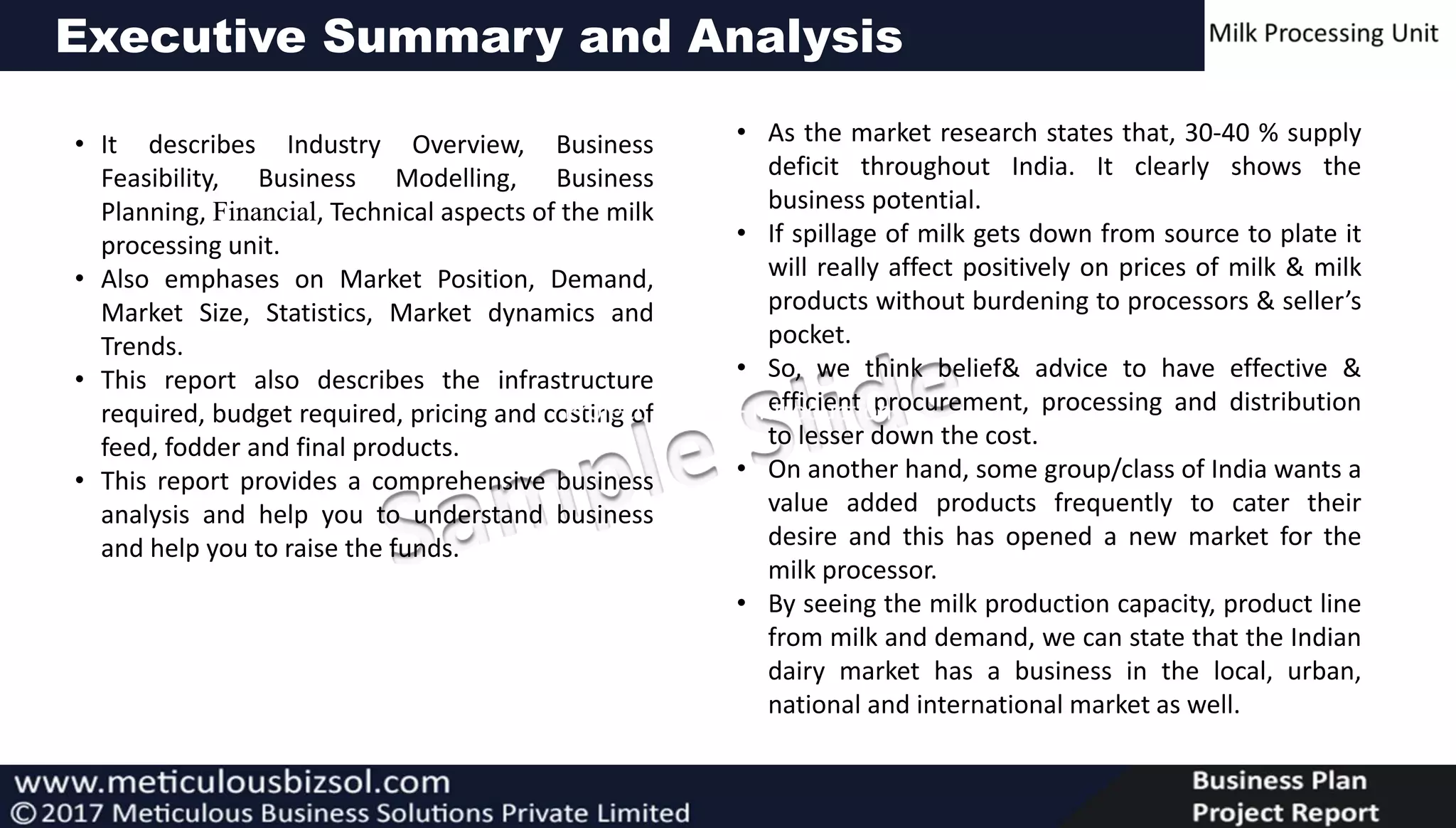 The document outlines a project profile for a milk processing unit, detailing industry overview, financial requirements, and market potential, including a 30-40% supply deficit in India. It highlights strengths such as enhanced market demand and opportunities for investment in dairy processing, as well as threats like substitute products and quality issues. The report includes financial summaries, employment needs, legal requirements, and operational projections to aid in business planning and funding acquisition.
