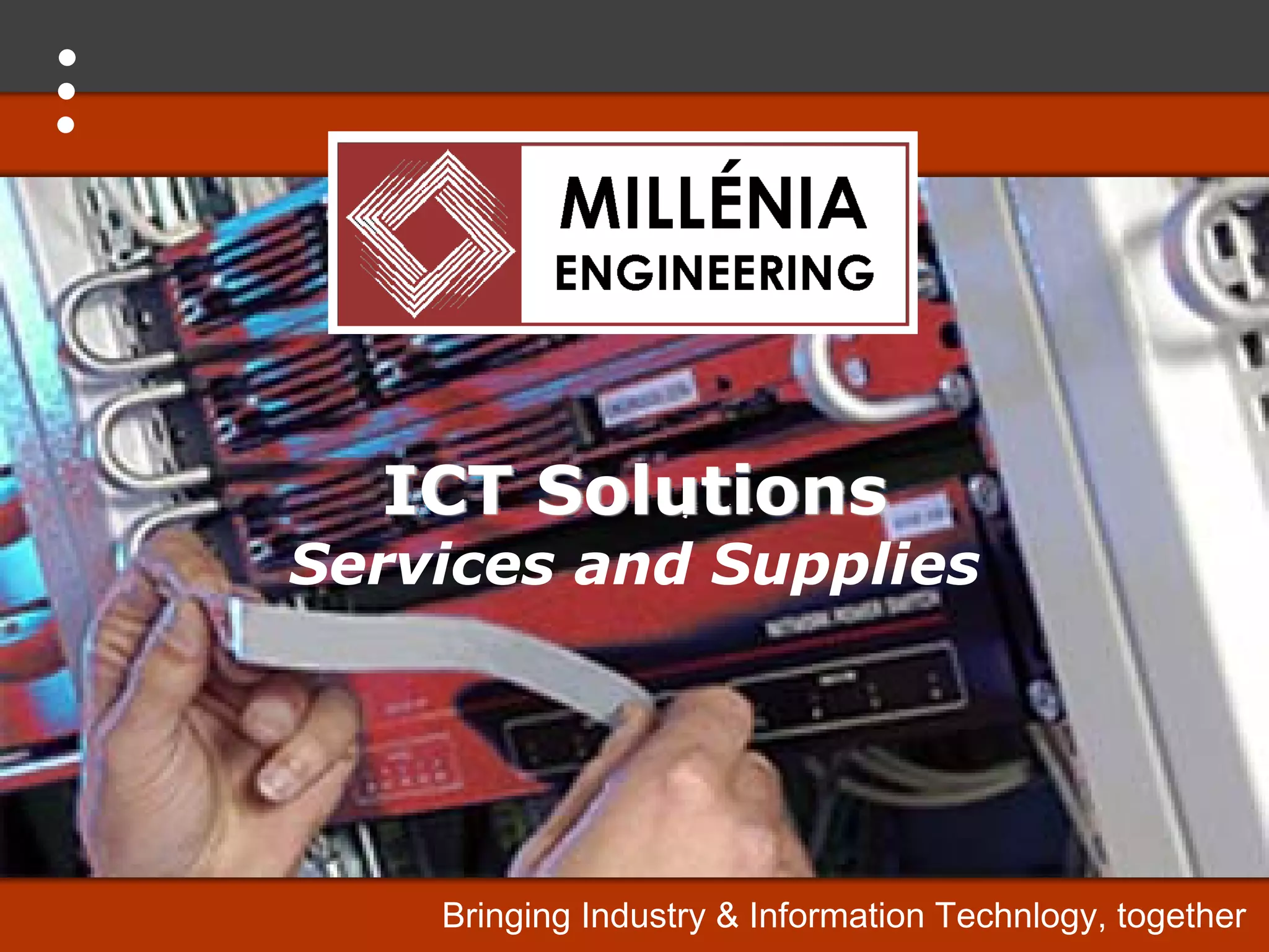 Millenia Engineering is an engineering and consulting company that provides multidisciplinary services for basic/detailed design and supervision of ICT business and industry projects. It offers a wide range of services including technical engineering, project management, procurement, planning, quality control, construction supervision, commissioning, and solutions operation.