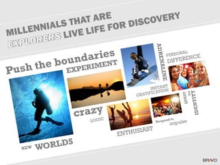 The document discusses the millennial generation, highlighting their significant economic impact as a large consumer group with an annual spending of approximately $2.45 trillion. It explores their characteristics, such as being optimistic, digitally native, and socially connected while also facing economic challenges, including high unemployment and student debt. Furthermore, it emphasizes that millennials are not a homogeneous group and marketers need to adapt their strategies to engage with diverse segments effectively.