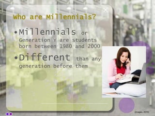 This document discusses the characteristics and learning preferences of Millennial students born between 1980 and 2000. Millennials grew up with technology and are considered the most "wired" generation. They spend over 6 hours per day using technology and prefer to learn through social media, games, and simulations. Millennials also want choice and control over their learning, prefer learning in groups, and expect immediate feedback. To teach Millennials effectively, the document recommends that educators develop an engaging learning environment that incorporates collaborative activities, group projects, and interactive teaching methods.