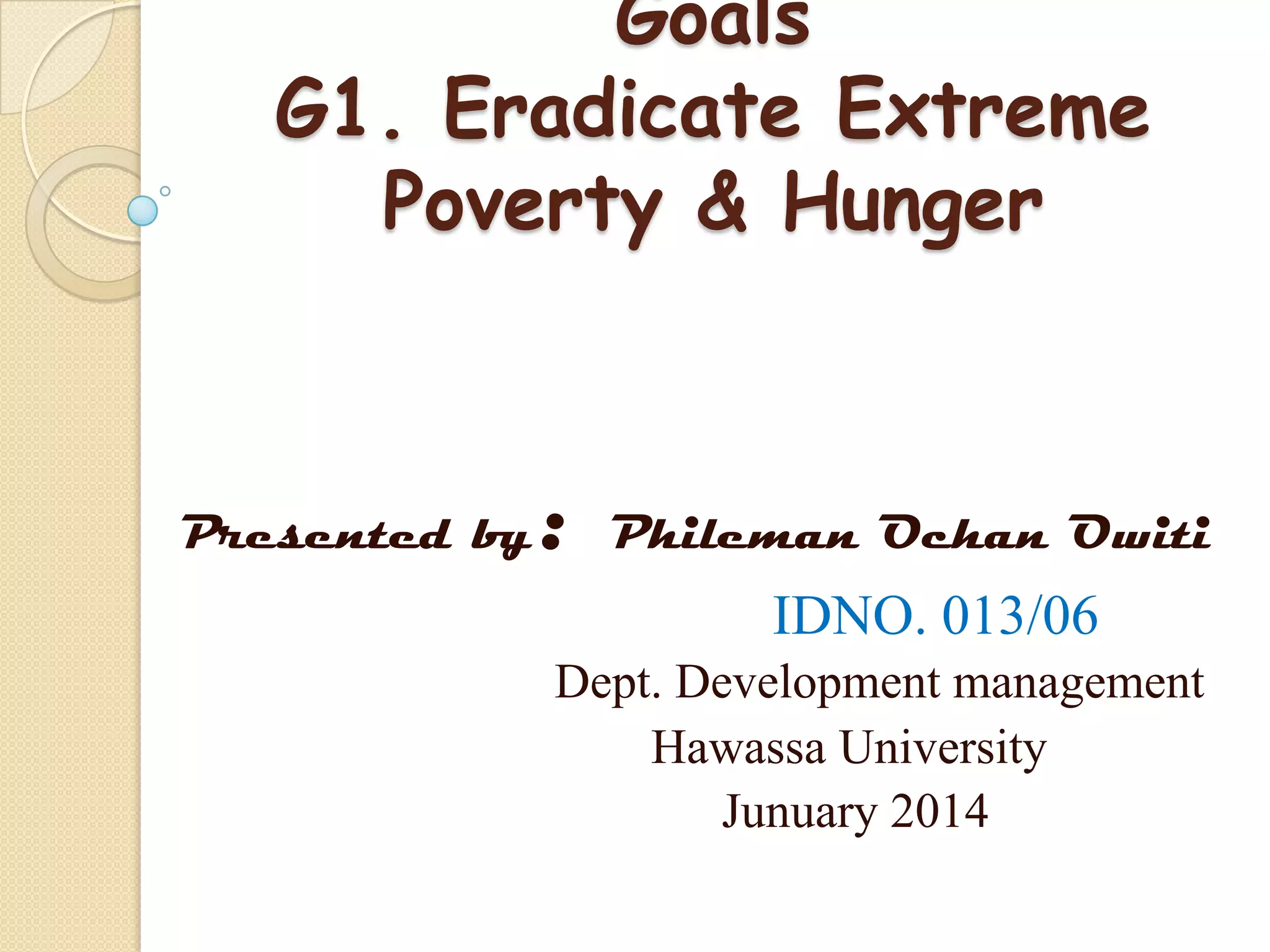 This document summarizes the goals and progress of Ethiopia in eradicating extreme poverty and hunger as outlined in the Millennium Development Goals. It provides context on the definition and causes of poverty in Ethiopia and describes the country's development plans including Agricultural Development Led Industrialization, the PASDEP, and the GTP which aim to achieve rapid economic growth to reduce poverty. While Ethiopia has made progress in decreasing its poverty rate and expanding infrastructure, it still faces challenges from climate change, global price fluctuations, and rising urban poverty that threaten its ability to fully eradicate extreme poverty and hunger by 2015.