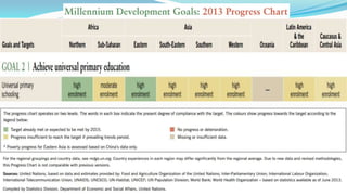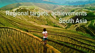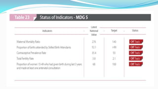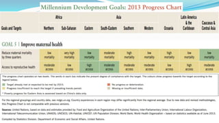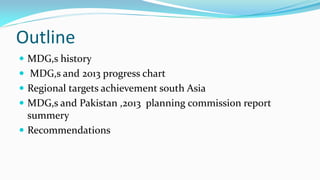 The document outlines the history and goals of the Millennium Development Goals (MDGs). It discusses the 8 goals, 18 targets, and 60 indicators established by the UN. It provides an overview of progress on the MDGs in South Asia, noting achievements in reducing poverty, improving education and health. However, it also notes areas still lagging like empowering women in Afghanistan and Pakistan. For Pakistan specifically, it analyzes progress against each goal and indicators, finding that only 2 targets have been achieved so far. Barriers to progress are identified as both internal challenges like low growth, and external factors like natural disasters. Localization and community involvement are emphasized as important for accelerating progress.