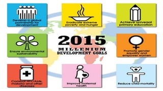The document summarizes the eight Millennium Development Goals agreed upon by UN member states in 2000 to be achieved by 2015. It provides details on each goal, including targets and some achievements. The eight goals are: 1) eradicate extreme poverty and hunger; 2) achieve universal primary education; 3) promote gender equality and empower women; 4) reduce child mortality; 5) improve maternal health; 6) combat HIV/AIDS, malaria, and other diseases; 7) ensure environmental sustainability; and 8) develop a global partnership for development.