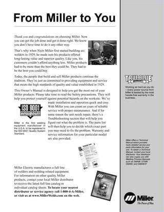 This document is an owner's manual for the Miller Thunderbolt 225 CC/AC Welding Power Source. It provides specifications for the welder including its rated output, amperage range, dimensions, weight, and other technical details. The majority of the document discusses important safety precautions for arc welding, including hazards from electric shock, arc rays, fumes and gases, compressed gas cylinders, and risks of fire or explosion. Proper protective equipment and ventilation are emphasized.