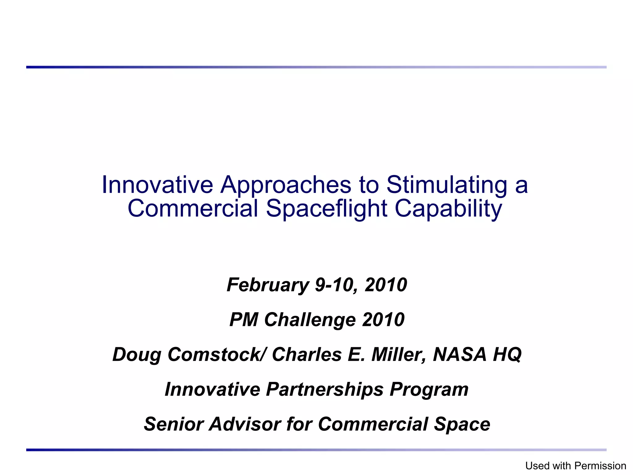 The document discusses using the National Advisory Committee for Aeronautics (NACA) approach to stimulate commercial spaceflight capabilities and achieve low-cost access to space. The NACA approach involved partnering with multiple government agencies and industry to broadly stimulate the aeronautics industry rather than picking specific winners. This open innovation model is proposed as an alternative to previous centrally-planned programs that aimed for the same goals but ultimately failed. The document argues the NACA approach successfully built a world-leading aeronautics industry in the U.S. in the early 20th century and could do the same now for commercial spaceflight.
