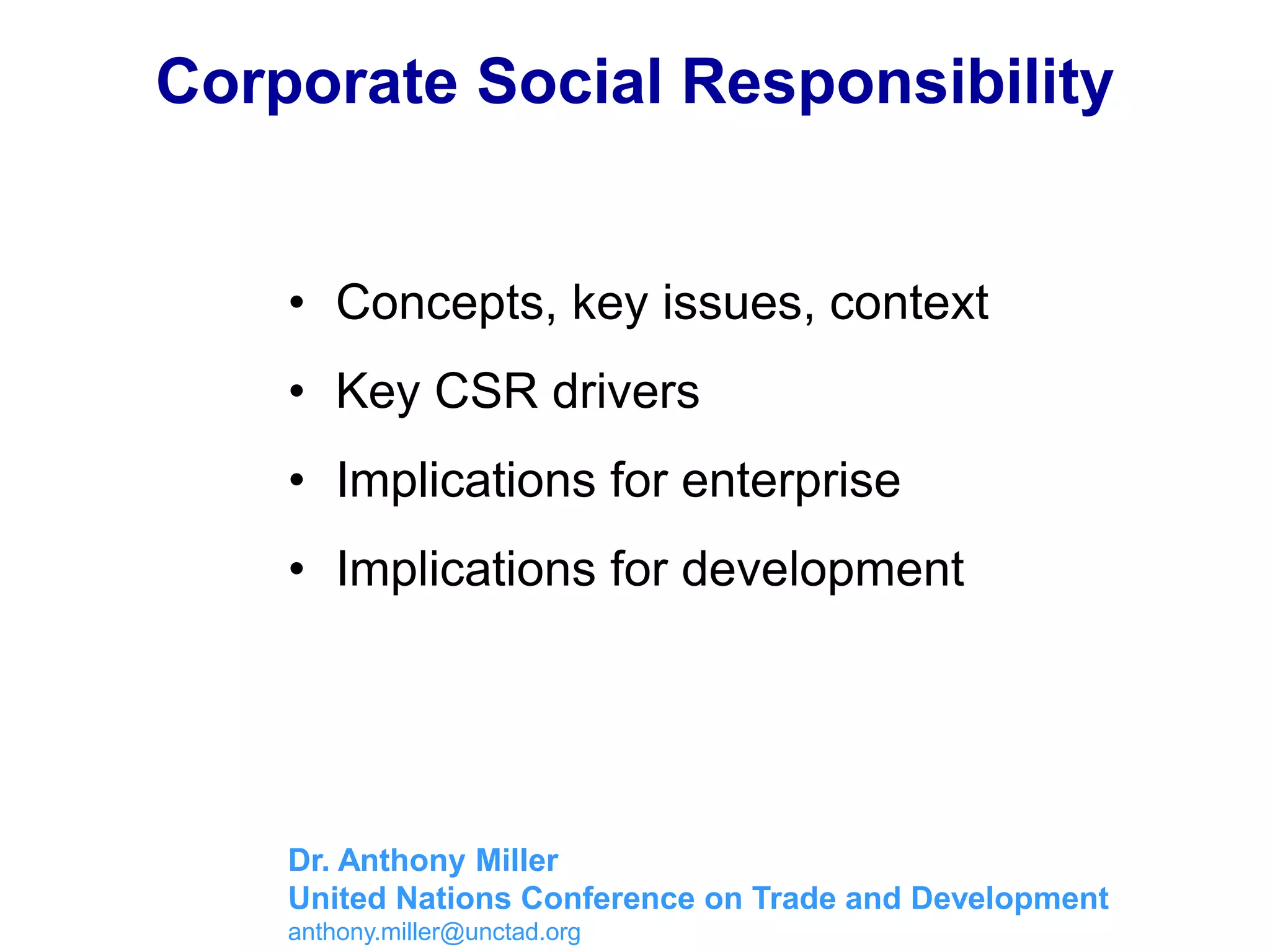 This document discusses concepts of corporate social responsibility including the social contract between firms and society, stakeholder theory, and Carroll's model of CSR. It outlines key issues in CSR such as labor rights, environmental conditions, and human rights. It then discusses the context and key drivers of CSR globally and in developing countries, including NGO activism, responsible investment, litigation, and government initiatives. The implications for enterprises include expanded spheres of influence and CSR management systems. For development, the document discusses the potential for CSR to positively impact labor conditions, environmental controls, and management techniques through supply chains, as well as debates around the economic impacts of CSR.