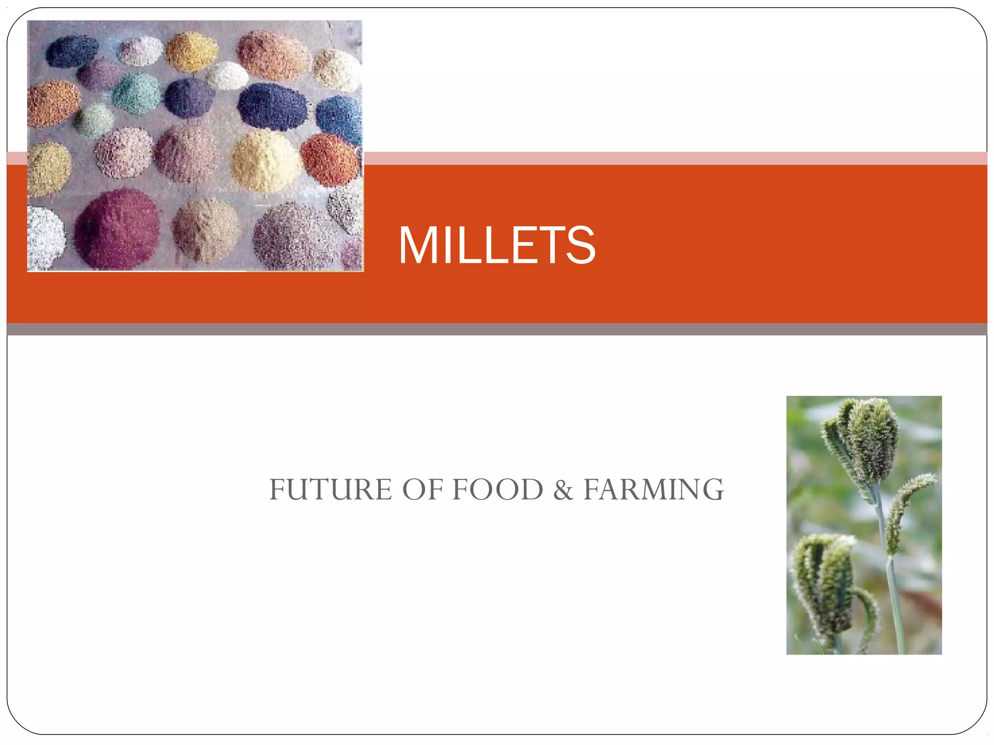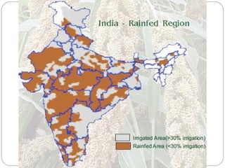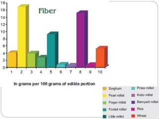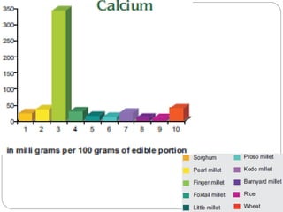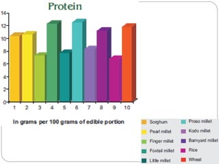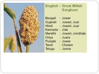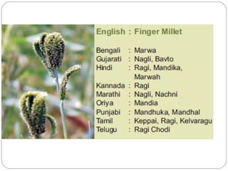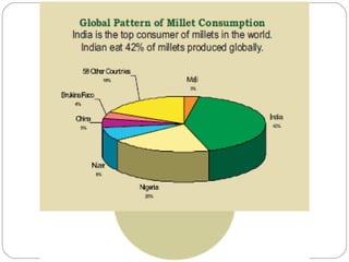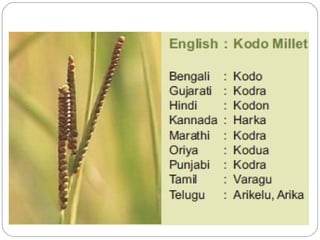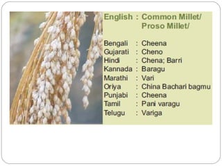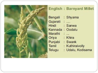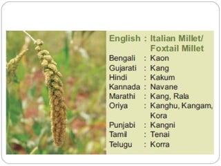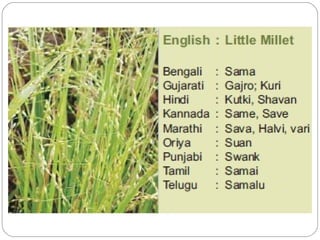 The document discusses millets, their cultivation in India, and their advantages. Millets require less water than other cereals, can grow in poor soils without fertilizers, and are pest-resistant. They allow for multiple intercropping and provide food, nutrition, fodder, fiber, and livelihood benefits. The document also briefly describes Coleus and Quails, noting their nutritional profiles and that Quails were first domesticated in Japan and later introduced to India for their high protein and rapid growth.