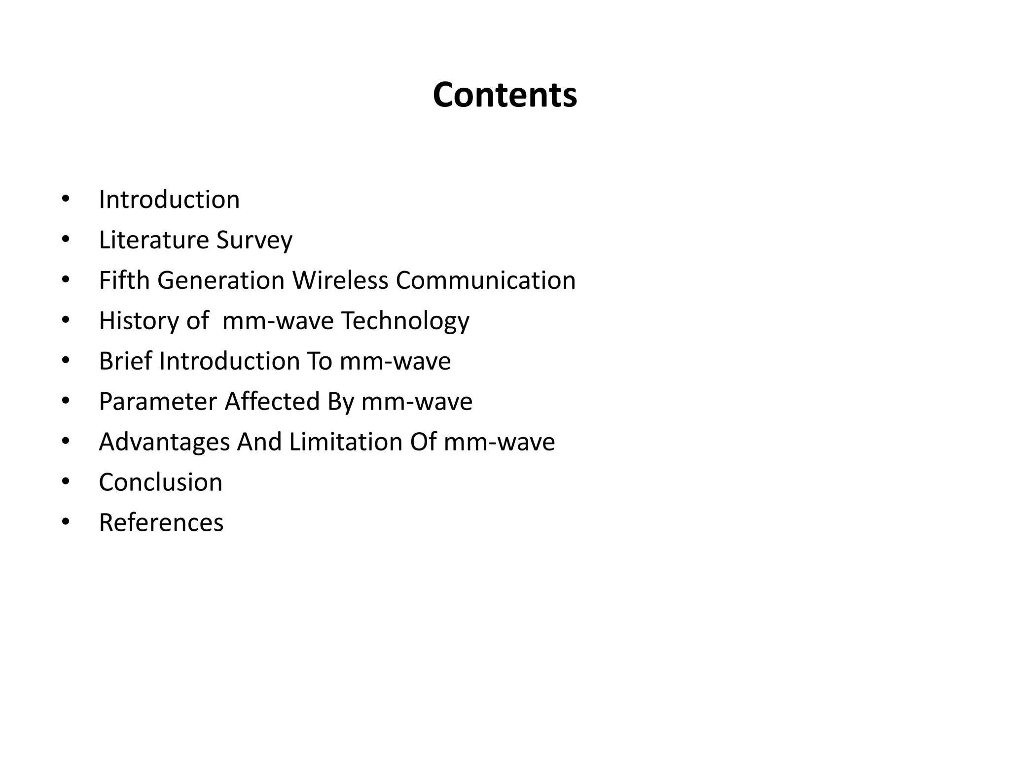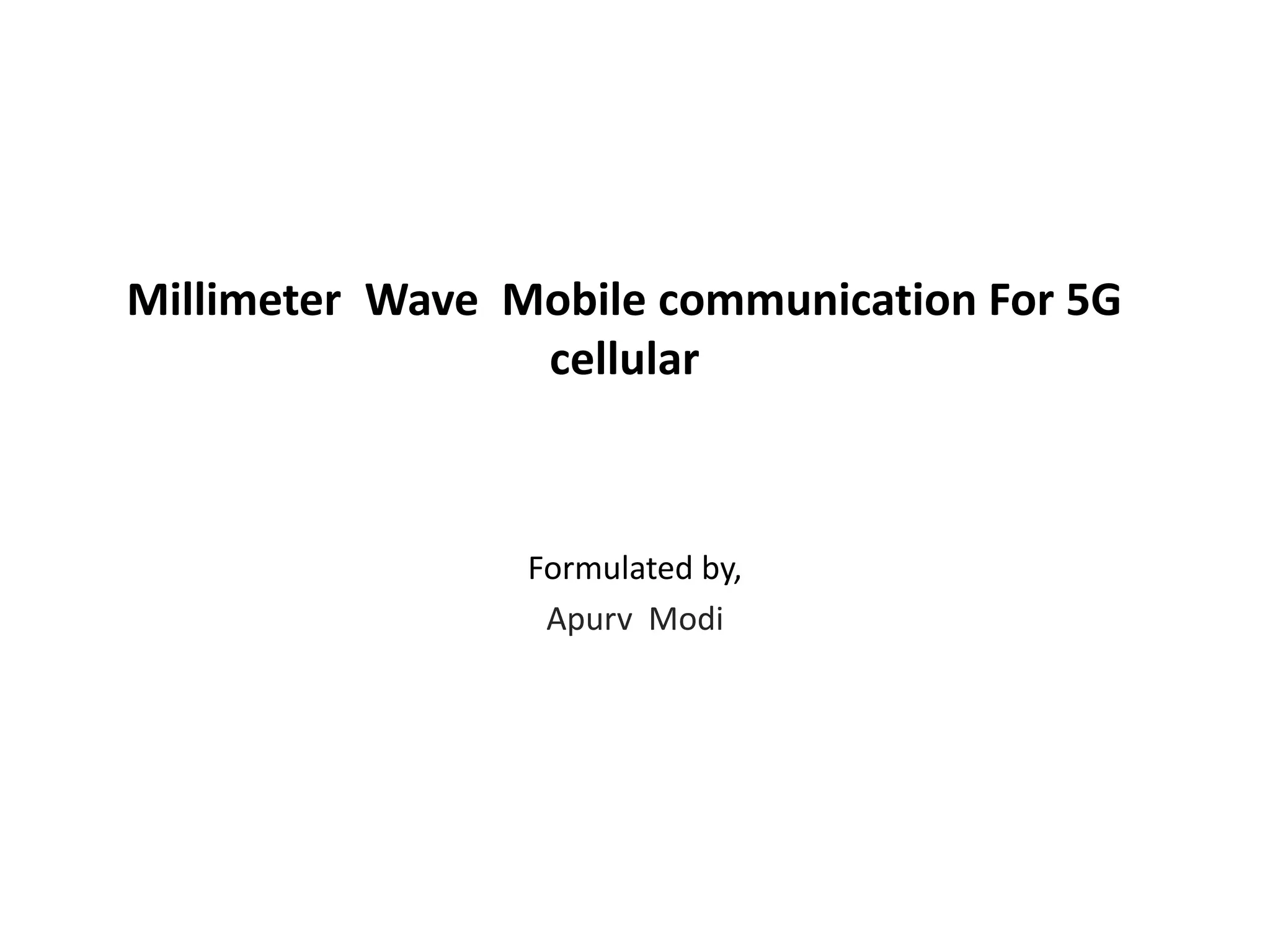 The document discusses the integration of millimeter wave technology in 5G cellular communication, highlighting its potential to provide higher data rates and address bandwidth shortages faced by current systems. It reviews the history, advantages, and limitations of mm-wave technology while comparing it to previous generations of cellular communication. Additionally, it emphasizes the need for further research on mm-wave characteristics and the implications for mobile communication infrastructure.