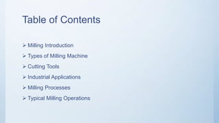 The document provides a comprehensive overview of milling machines, including their types (horizontal and vertical), cutting tools, and typical milling operations. It details the structure and function of various machine parts, such as the spindle, knee, and table, and outlines specific milling processes like face milling and gear cutting. Additionally, the document compares vertical and horizontal milling machines regarding cost, surface finish, and operational efficiency.