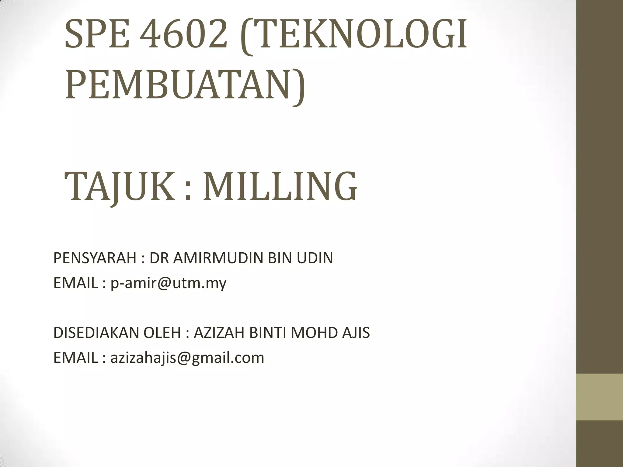 Dokumen tersebut membahas tentang proses milling pada mesin pengisar, termasuk definisi proses milling, jenis-jenis mesin dan mata alat pengisar, kaedah pengisaran, operasi pengisaran, dan langkah keselamatan dalam menggunakan mesin pengisar.