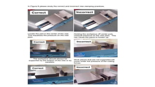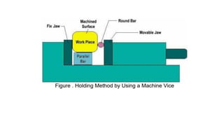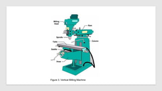 This document provides an overview of milling machines and milling processes. It describes the two main types of milling machines - horizontal and vertical milling machines. It outlines common cutting tools and industrial applications of milling. The key milling processes of spindle speed, feed rate, depth of cut, and cutter rotation direction are explained. Typical milling operations such as plain milling, end milling and gang milling are defined. The document also covers workholding methods and the importance of vice alignment and safety practices.