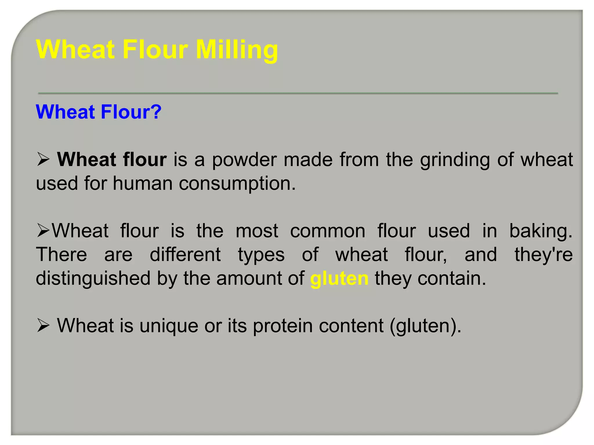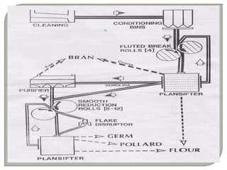 This document discusses different types of wheat flour and flour milling processes. It explains that wheat flour is made by grinding wheat kernels and is commonly used in baking. Different types of wheat flour contain varying amounts of gluten, which gives dough elasticity and baked goods structure. The milling process breaks wheat kernels, removes the bran and germ, and grinds the endosperm into flour. Milling produces flour, bran, germ, and pollard. The document also discusses non-wheat flours from grains like rice, corn, rye, and oats.