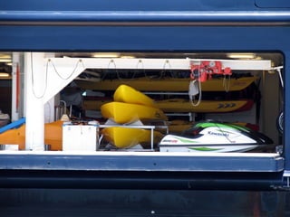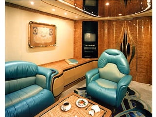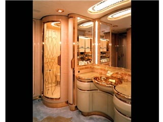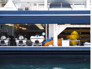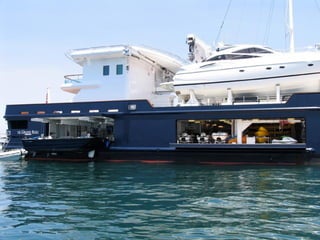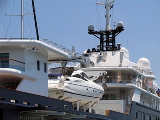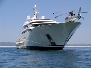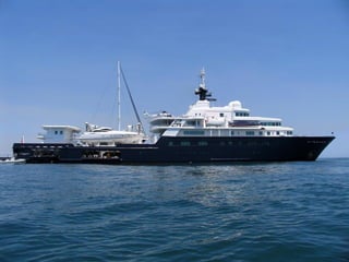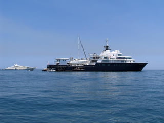 Greg Norman had a 228-foot yacht called 'Aussie Rules' custom built for $70 million, which included several smaller boats and water toys kept onboard. The yacht has a master bedroom, dining room, cinema, and other amenities. Other billionaire yachts are shown for comparison, including Roman Abramovich's fleet that uses tenders to transport between his main vessel and shore.