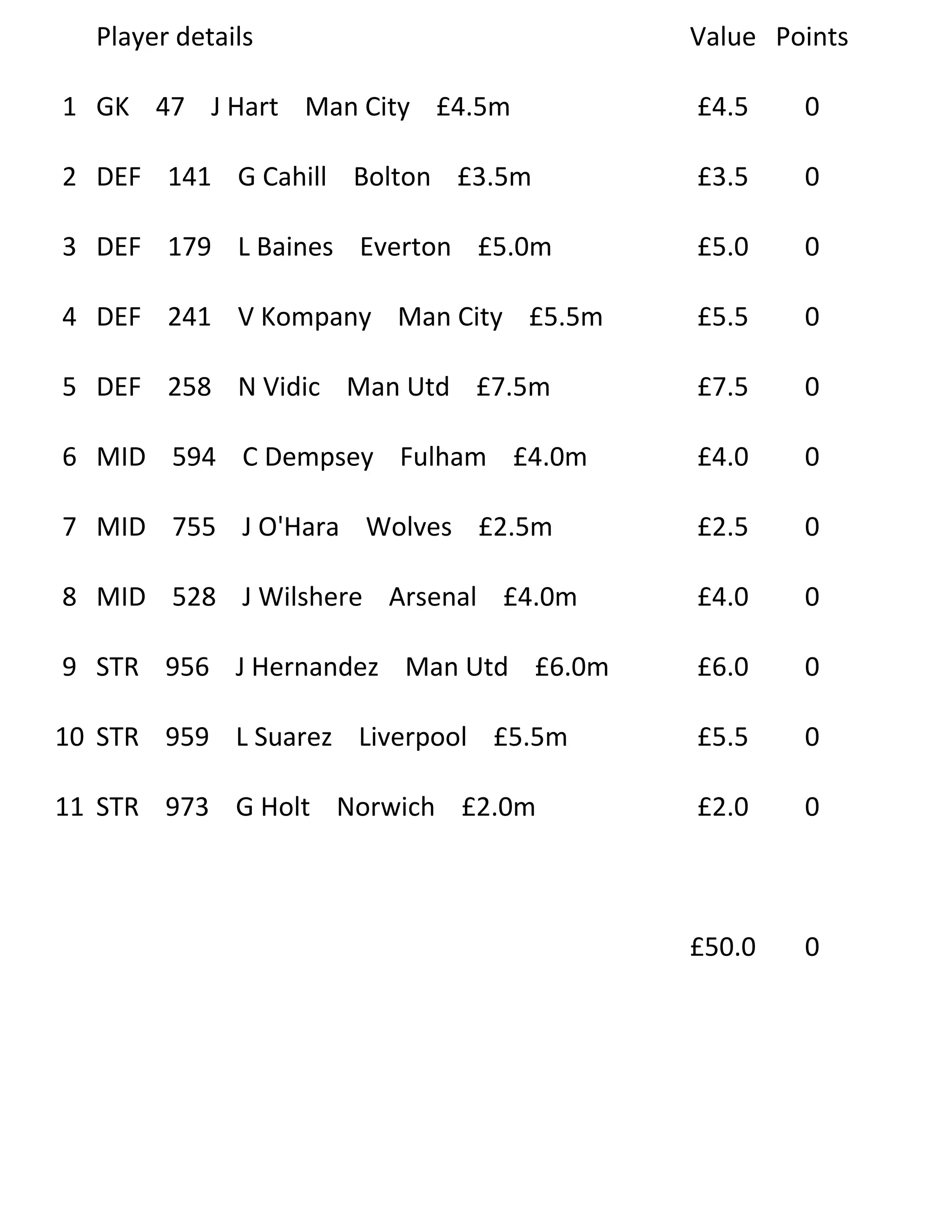 This document shows a fantasy football team roster listing 11 players across goalkeeper, defender, midfielder, and striker positions. It provides each player's name, team, value in pounds, and total points scored. The total value of the team is £50.0 with a current total points of 0.