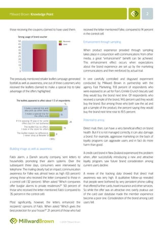 Direct marketing can boost brand awareness, interest, and image while achieving an immediate response like a purchase. However, direct mail risks being ignored or annoying recipients. To maximize benefits, marketers should consider audience receptiveness, ensure mail has impact, and extend processing time. Testing showed physical mail generated stronger emotional processing than virtual materials. Persuasive direct mail motivated trial for new products through samples and vouchers. But overly aggressive marketing also risked irritating customers.